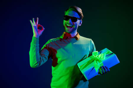 expressing positivity. bachelor. he is life of the party. leisure on happy weekend. excited handsome guy with gift having fun. fashion look. enjoying party celebration
