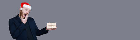 Bearded caucasian man with a santa hat is gesturing surprisement while holding a box with present on a gray studio wall with free space