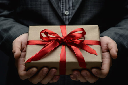Man in black suit holding gift box with red bow