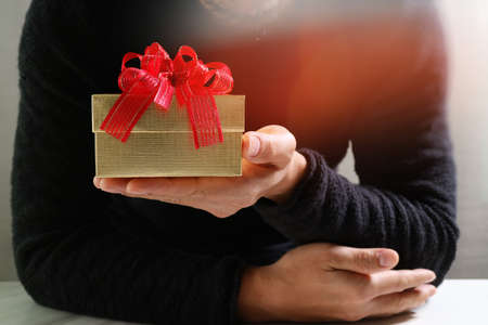 Hands holding gift box, present on the table and light of bokeh background. Valentine's Day, Christmas, Birth day, New year and Anniversary concept.