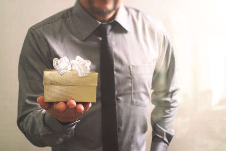 gift giving,businessman hand holding a gift box in a gesture of giving,front view,filter effect