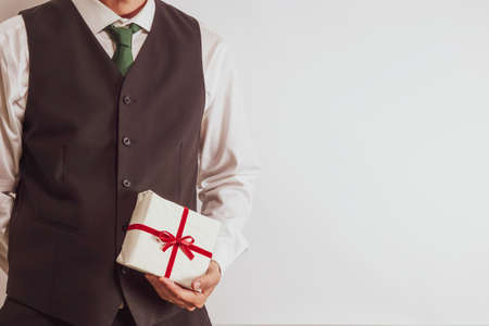 Man in white shirt and black suit vest holding a Christmas gift / present. Copy space for text on white background.
