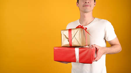 Cropped view of young handsome man holding gift boxes on yellow background. Big gold box with red ribbon. Holidays concept. High quality photo