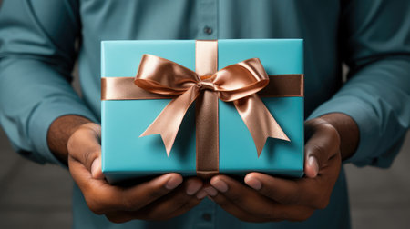 A man holds a green gift box. The image shows a close-up of the gift with a silver ribbon, against a blurred background. The subject is wearing a blue sweater and appears to be in an indoor setting. This image is suitable for various commercial uses.