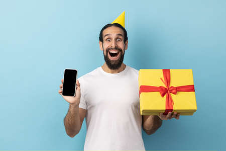 Portrait of man wearing white T-shirt in birthday cone holding gift box and cell phone with mockup, copy space for advertisement, blank display. Indoor studio shot isolated on blue background.