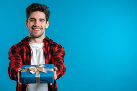 Handsome man holding christmas gift and gives it by hands it to camera. He is happy, smiling. Guy on blue background. Positive holiday shot