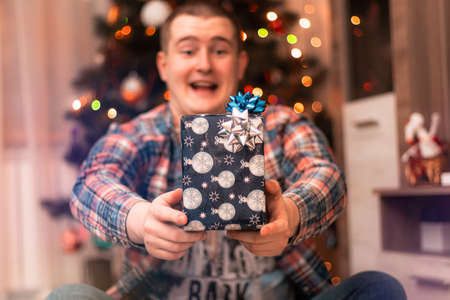 Young man with a blue gift box in his hands near the Christmas tree and lights. A boy gives a present celebrating New year. Winter holidays concept