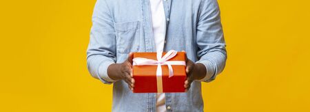 Red Christmas Gift Box In Hands Of Unrecognizable African American Man Over Yellow Studio Background, Panorama