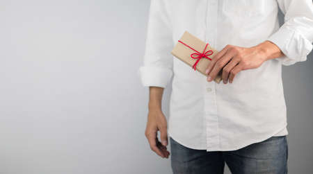 Present box in male hands behind back, boxing day