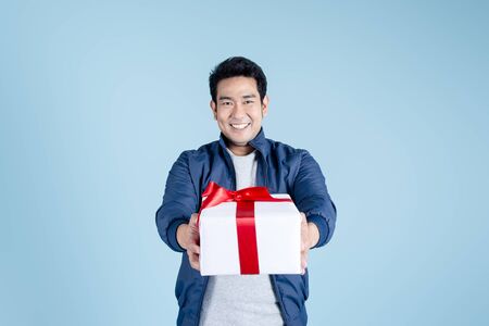 Happy Asian man wearing blue jacket and holding gift box on blue background.
