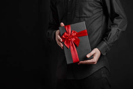 A guy in a black shirt is holding a gift with a red ribbon. Black background. Black gift box in hands.