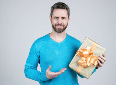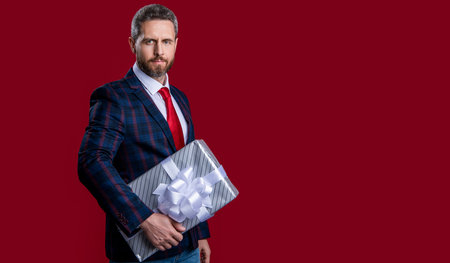 handsome mature man businessman with beard holding present or gift box, birthday