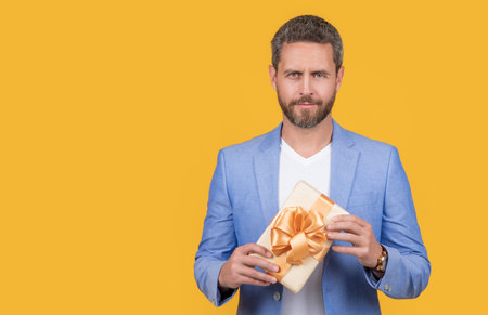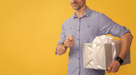 man hold gift box isolated on yellow background with copy space. man hold gift box in studio.