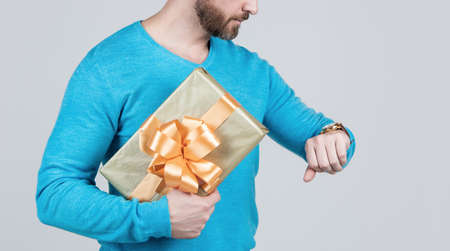 cropped man holding present or gift box and checking time on wristwatch, shopping time