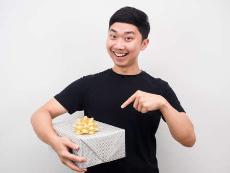 Happy man point finger at gift box in his hand