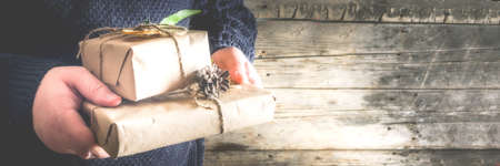 Man or old woman hands holds christmas gifts. Human hands with rustic decorated gift boxes, in craft paper and organic decorations. Top view copy space