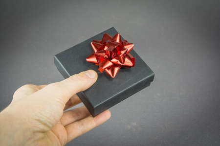 Men's hand holds a little cute gift in a decorated box against the background of the dark wall