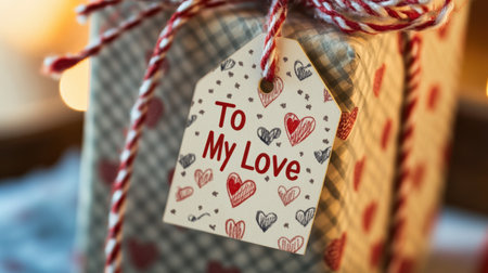 A close-up of a gift tag attached to a Valentine's Day present, reading To My Love with heart illustrations.
