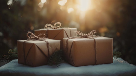 Beautifully wrapped Christmas gift boxes rest on a white table, bathed in soft warm light during the holiday season.