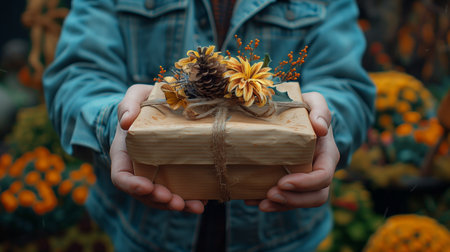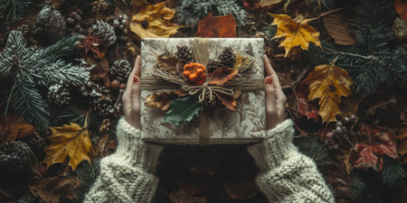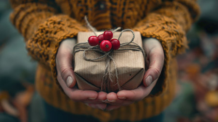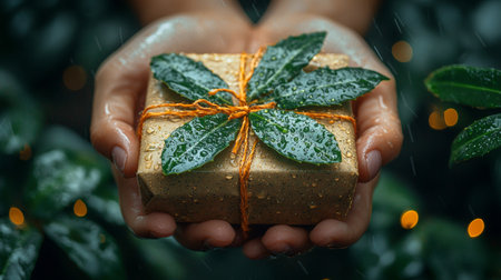 A pair of hands holding a beautifully wrapped eco-friendly gift box adorned with natural leaves and twine, symbolizing sustainability and care.