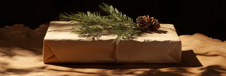Gift wrapped in natural brown paper, adorned with pinecones and pine branches, all set against a softly lit background that enhances warmth.