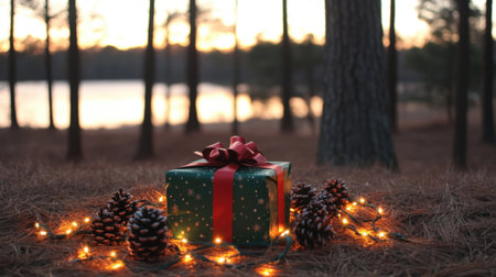 A beautifully wrapped green gift box with a red ribbon sits on the forest floor, surrounded by pinecones and glowing fairy lights, creating a serene holiday atmosphere.