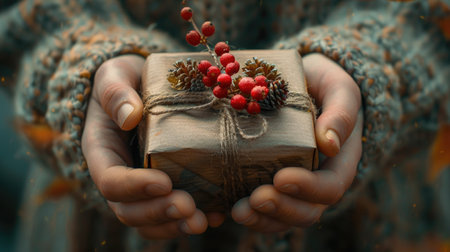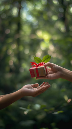 A serene scene featuring hands delicately holding a vibrant red gift box adorned with a white ribbon, surrounded by lush greenery, embodying the spirit of giving and celebration.