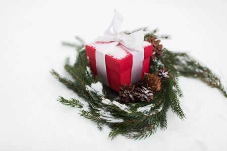 Red Christmas gift box and fir tree on snow. Christmas home decoration with snow and tree on blurred background at daytime with copy space. Selective focus. New Year attributes on background