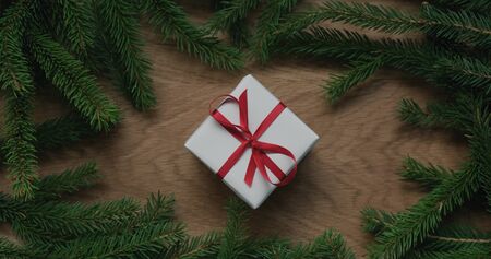 Top view christmas composition with white gift box and spruce branches, wide photo