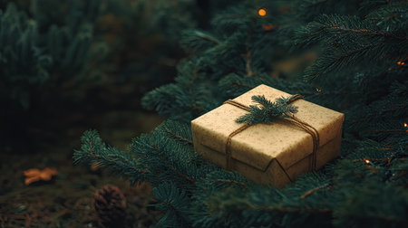 Background of a gift box surrounded by the natural beauty of a pine tree, bringing a festive and nature-inspired touch to holiday decor.