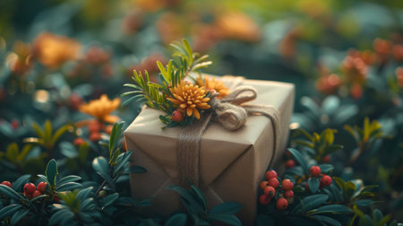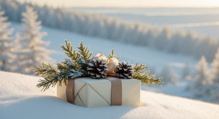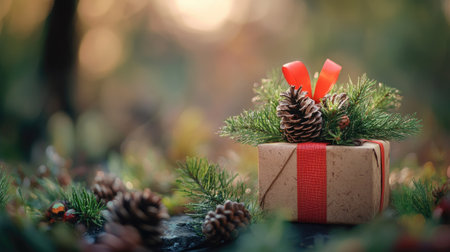 Elegant gift box adorned with natural pine branches, cones, and twine, set against a soft holiday background, perfect for New Year gifting photography