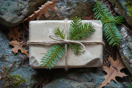 A beautifully wrapped rustic gift set against a backdrop of pine branches and cones. Ideal for holiday decorating, seasonal promotions, and crafting projects.