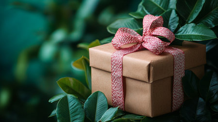 A close-up of a wrapped gift box with a pink ribbon, surrounded by lush green leaves creating a festive atmosphere.