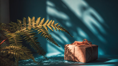 A small, wrapped gift box with a ribbon sits near a fern branch, casting shadows on a blue wall. The composition uses natural sunlight, creating a dramatic play of light and shadow. This image is suitable for use in various projects, including advertisements, websites, and promotional materials.