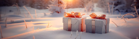 AI Generated. A neatly wrapped gift with natural decorations on a quiet snowy hill overlooking the horizon surrounded by gentle winter shadows