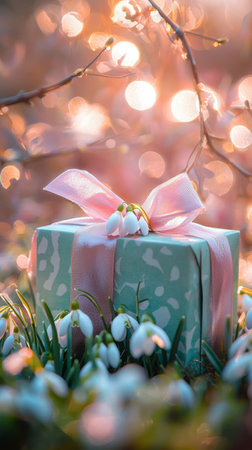 Beautiful gift box among snowdrops with soft bokeh background in springtime