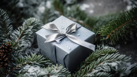 Christmas gift box with a silver bow on a spruce branch covered with snow