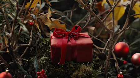 Christmas gift wrapped in red velvet ribbon, set among branches and tiny ornaments for a warm holiday feel