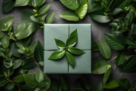 Green leaves arranged artistically with homemade gift box. Flat lay. Nature inspiration.