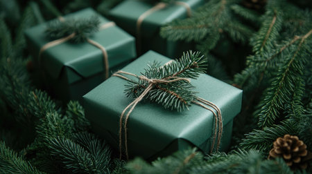 Charming green Christmas gift boxes surrounded by lush pine branches on a deep green backdrop, perfect for a cozy holiday setting.