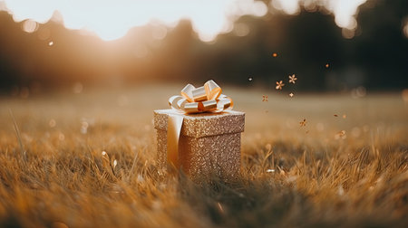 Gift box on golden grass with bokeh lights background.