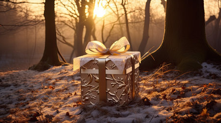 Gift box in winter forest at sunset. Christmas and New Year concept.