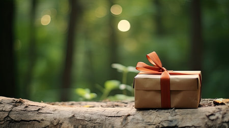 Gift box with golden ribbon on a background of the forest.