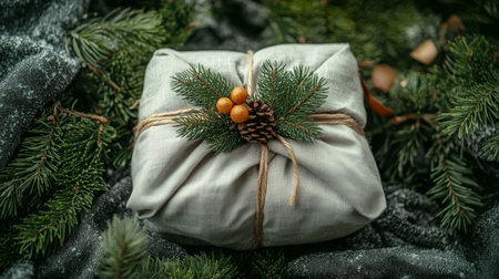 A beautifully wrapped gift rests on a textured surface, adorned with a pine sprig and a pinecone, capturing a cozy, seasonal atmosphere.