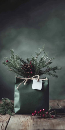 Christmas gift bag with evergreen branches and red berries on wooden table, background with copy space, AI Generated