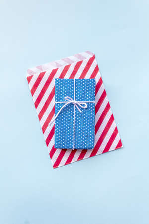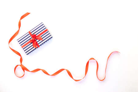 Gift blue striped box with a red satin bow. Isolated on the white background. Holiday concept. Flat lay.