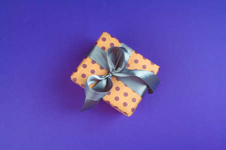 Gift box on purple background top view