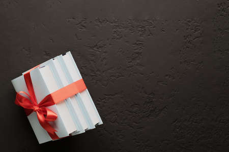 Gift box on a dark background. Top view with place for text
