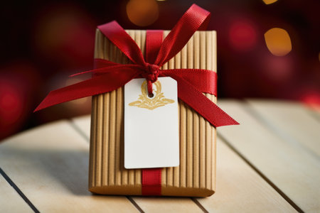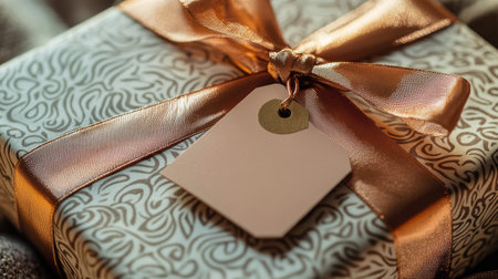 A beautifully wrapped gift with a luxurious satin ribbon and a gold gift tag, ideal for a special celebration