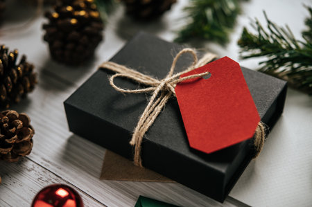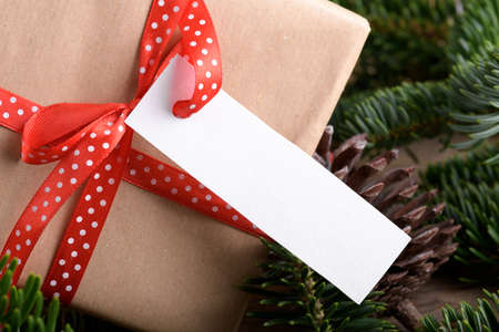 Blank gift tag on wrapped christmas present with festive pine and ornament decor